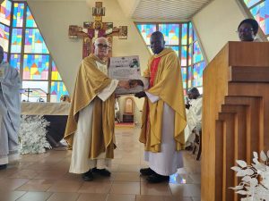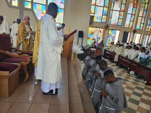 The Mass was presided over by the Provincial Custos, Friar Vitus Edem Yao MENSAH. In his homily, he advised the newly-professed, as well as all present, not to waste time building hopes on false securities. Instead, he urged them to look to Jesus as their only sure foundation and to make Him their primary focus. He also exhorted the newly professed to emulate the older friars who have made great efforts in their vocation and are celebrated as beacons of hope in the Custody. The jubilarians were offered citations, Papal blessings and “token envelopes” [often containing a monetary gift or a small token of gratitude] for their dedicated service.